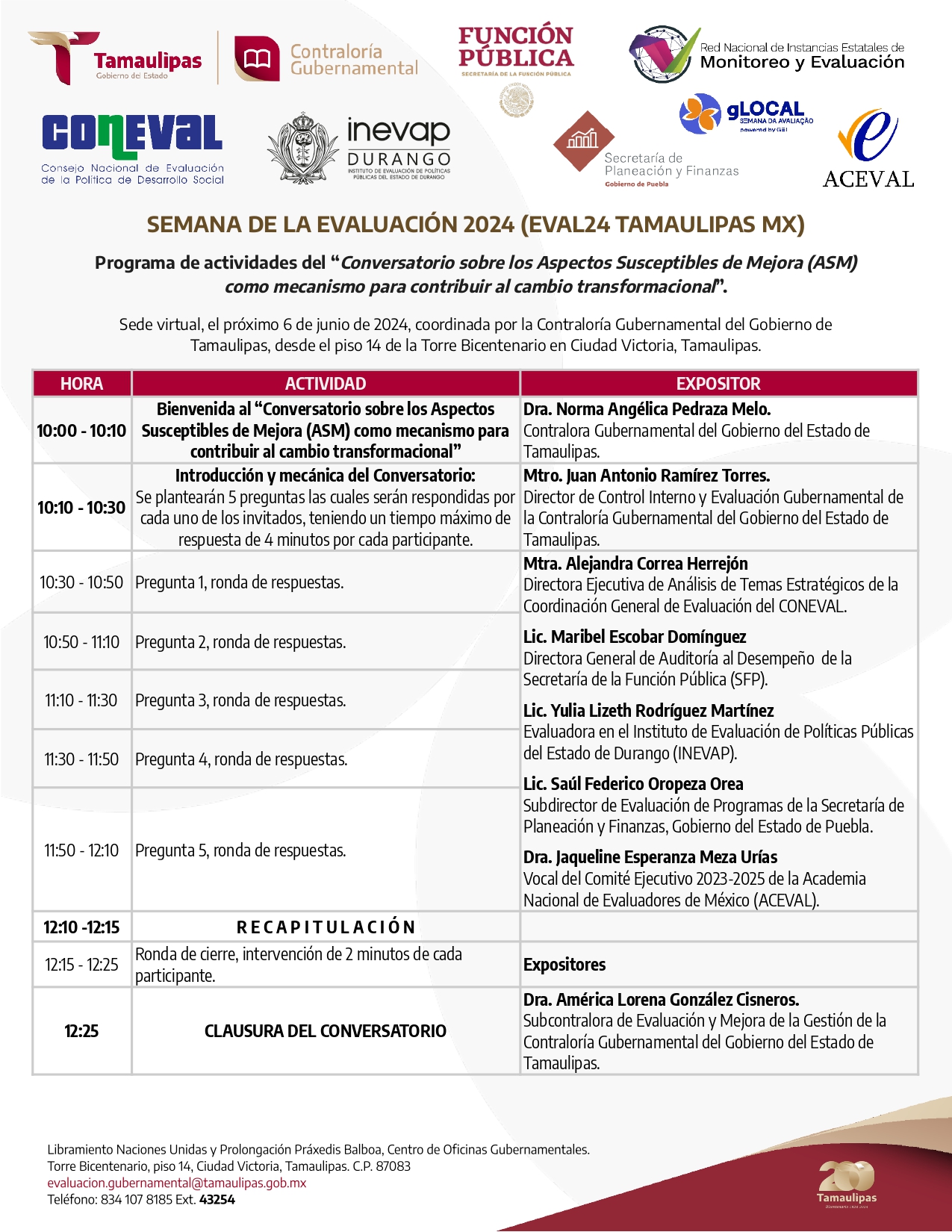 | Lic. Maribel Escobar Domínguez | “Conversatorio sobre los Aspectos Susceptibles de Mejora (ASM) como mecanismo para contribuir al cambio transformacional” | Directora General de Auditoría al Desempeño de la Secretaría de la Función Pública del Gobierno de México. |