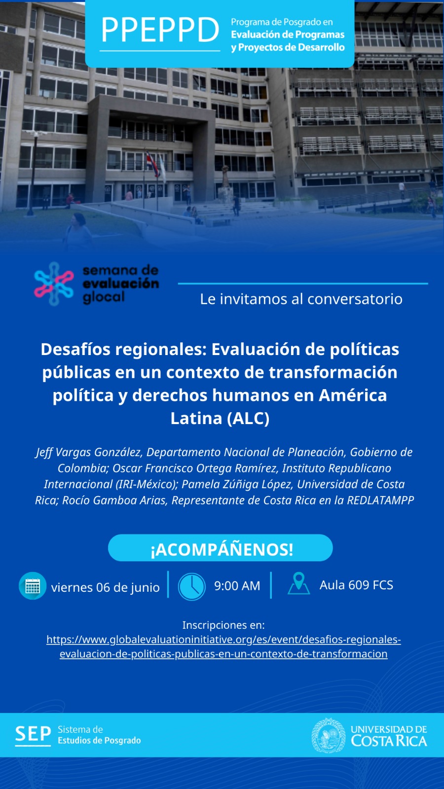Esta actividad se realiza presencialmente en: Aula 609 FCS (miniauditorio), Facultad de Ciencias Sociales, 6to piso, torre B, Ciudad de la Investigación, San Pedro de Montes de Oca, San José, Costa Rica