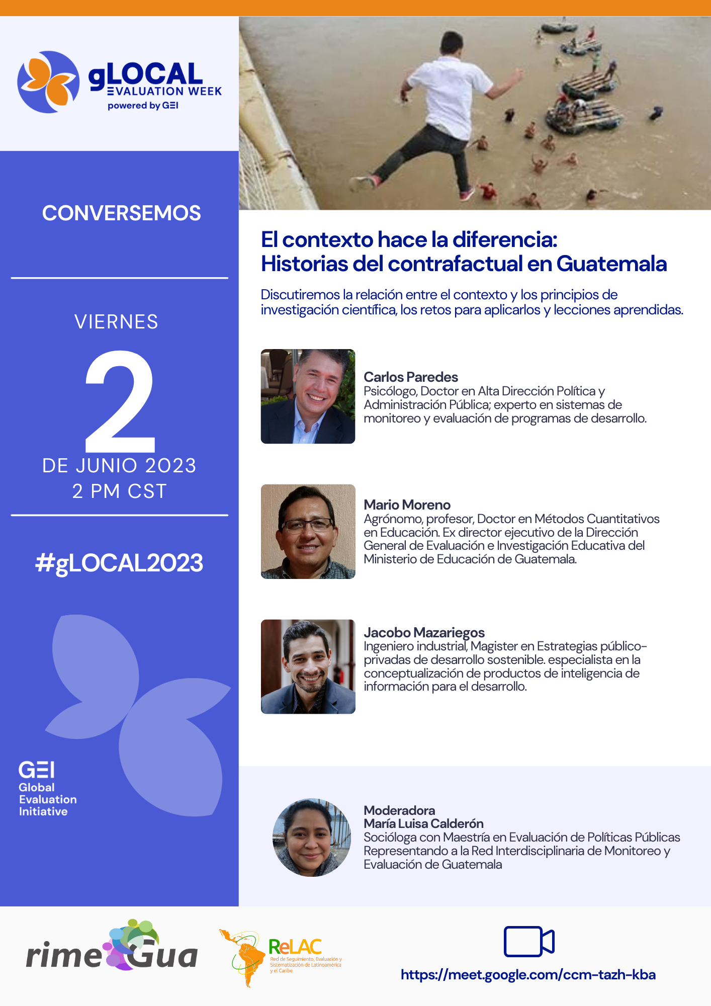 La evaluación de impacto es más que una tendencia, lo pueden decir los Nobel Banerjee, Duflo, y Kremer con su enfoque experimental para aliviar la pobreza global, y generalmente propuesta como LA mejor forma de generar evidencia. Sin embargo, los equipos de MyE en países como Guatemala que deben aplicar estas metodologías y modelos con una serie de retos: escasa literatura en el idioma y expertaje local, tiempo limitado para capacitarse, contextos culturales diversos, diseños discordantes con necesidades actuales. Investigadores con experiencia en MyE que realizan evaluaciones de resultados/impacto narran la relación entre el contexto y los principios de investigación científica aplicados y lecciones aprendidas.