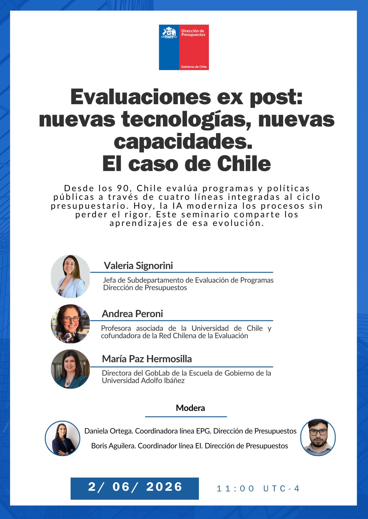 Desde los 90, Chile realiza evaluaciones ex post radicadas en la Dirección de Presupuestos. Hoy cuenta con cuatro líneas integradas al ciclo presupuestario que analizan el diseño, implementación, eficiencia y resultados de programas y políticas públicas. La reciente incorporación de IA y nuevas tecnologías ha optimizado la selección de evaluadores, automatizado procesos y análisis de hallazgos para la toma de decisiones. Este seminario busca compartir aprendizajes y desafíos de esta evolución, destacando cómo innovar sin perder el rigor en la evaluación ex post.