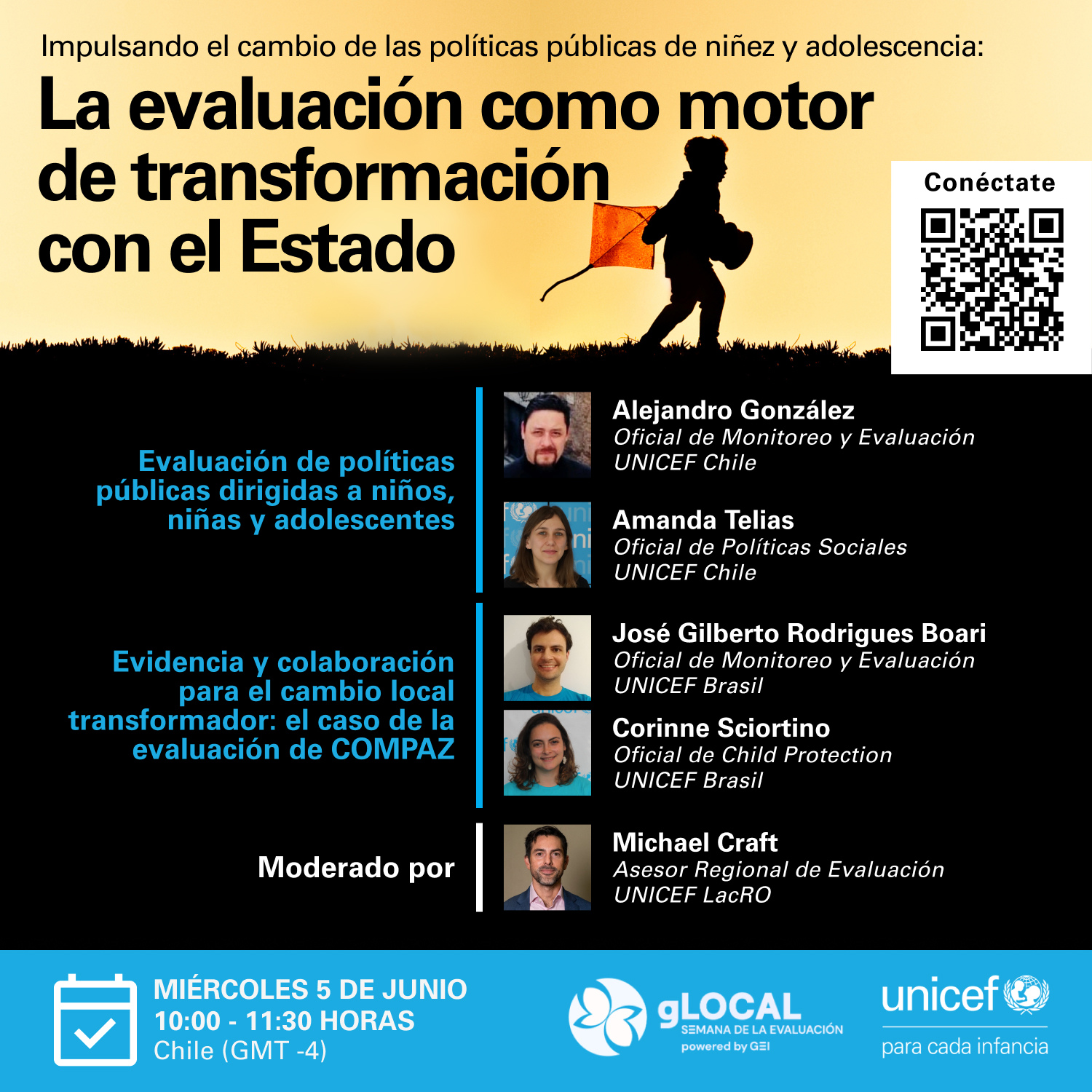 Se revisarán experiencias de evaluación de políticas e intervenciones públicas de niñez y adolescencia conducidas o apoyadas por UNICEF en la región LAC, en trabajo colaborativo y alianzas con contrapartes de Gobierno. Se explora las dimensiones metodológicas, y cómo esta herramienta puede abogar por soluciones impactantes para este grupo poblacional, desde estrategias para promover políticas inclusivas hasta fortalecer sistemas de evaluación a nivel nacional. A través de la modalidad de panel, miembros de UNICEF de oficinas de Latinoamérica y el Caribe como Chile y Brasil, propiciaran un intercambio de experiencias, prácticas y conocimientos con el fin de impulsar acciones concretas que potencien el desarrollo de políticas públicas a nivel regional, a través de evaluaciones colaborativas y locales.