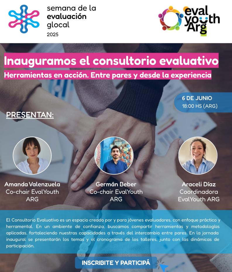 El Consultorio Evaluativo es un espacio creado por y para jóvenes evaluadores, con enfoque práctico y herramental. En un ambiente de confianza, buscamos compartir herramientas y metodologías aplicadas, fortaleciendo nuestras capacidades a través del intercambio entre pares. En la jornada inaugural se presentarán los temas y el cronograma de los talleres, junto con las dinámicas de participación. El encuentro será un panel moderado por miembros de EvalYouth Argentina, con la participación de los expositores.