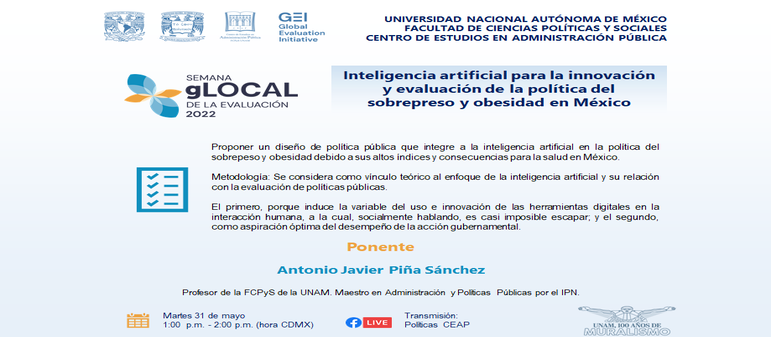 Proponer un diseño de política pública que integre a la inteligencia artificial en la política del sobrepeso y obesidad debido a sus altos índices y consecuencias para la salud en México. Metodología: Para este fin, se considera como vínculo teórico al enfoque de la inteligencia artificial y su relación con la evaluación de políticas públicas. El primero, porque induce la variable del uso e innovación de las herramientas digitales en la interacción humana, a la cual, socialmente hablando, es casi imposible escapar; y el segundo, como aspiración óptima del desempeño de la acción gubernamental.