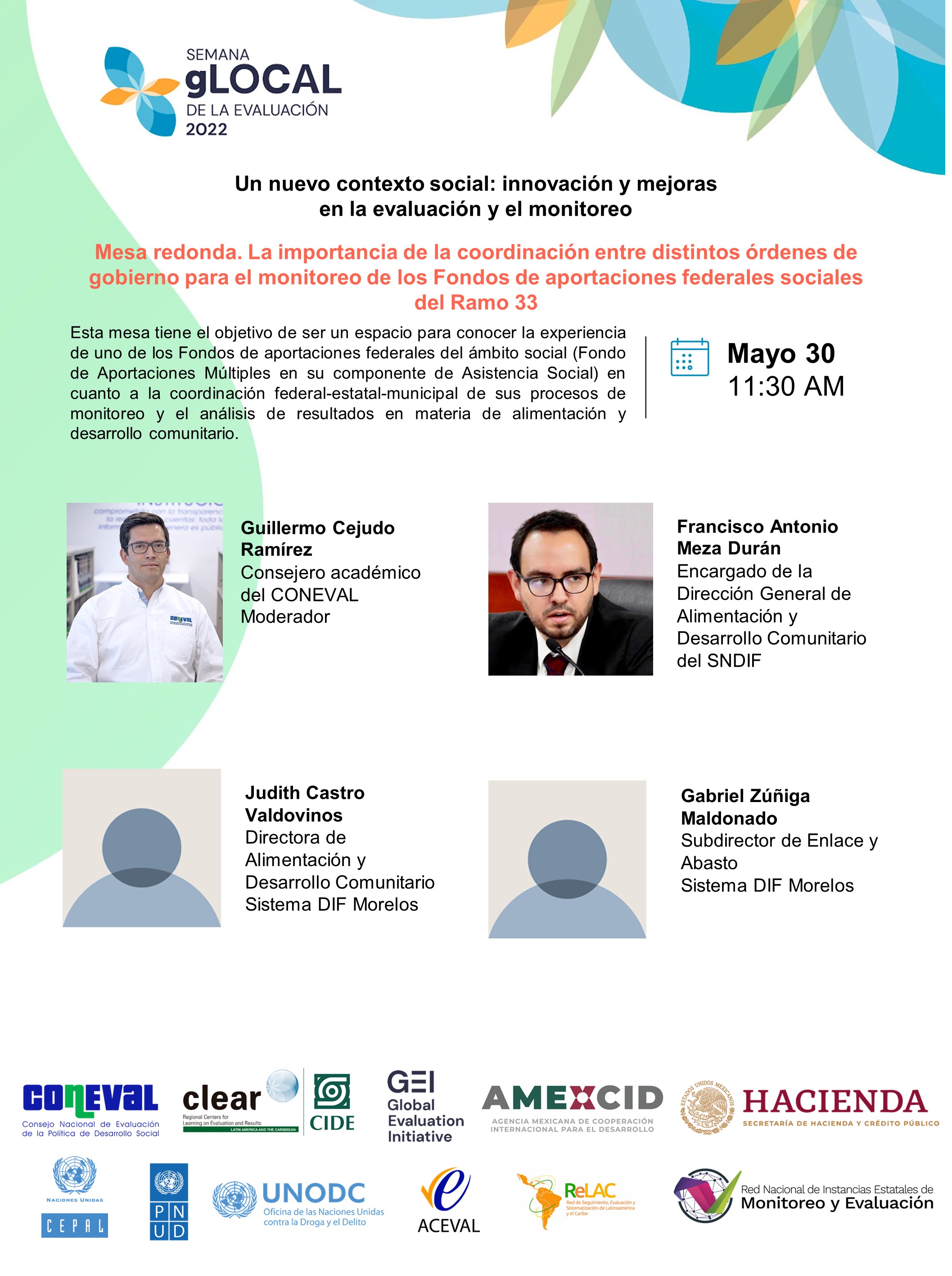 Para llevar a cabo el monitoreo de los Fondos de aportaciones federales del ámbito social es de suma importancia que existan mecanismos de coordinación claros entre los diferentes órdenes de gobierno a fin de contar con información relevante, útil y de calidad para la toma de decisiones. En esta mesa se abordará el caso del Fondo de Aportaciones Múltiples en su componente de Asistencia Social (FAM-AS) con la intención de conocer su experiencia en cuanto a la coordinación federal-estatal-municipal de sus procesos de monitoreo y el análisis de resultados en materia de alimentación y desarrollo comunitario.