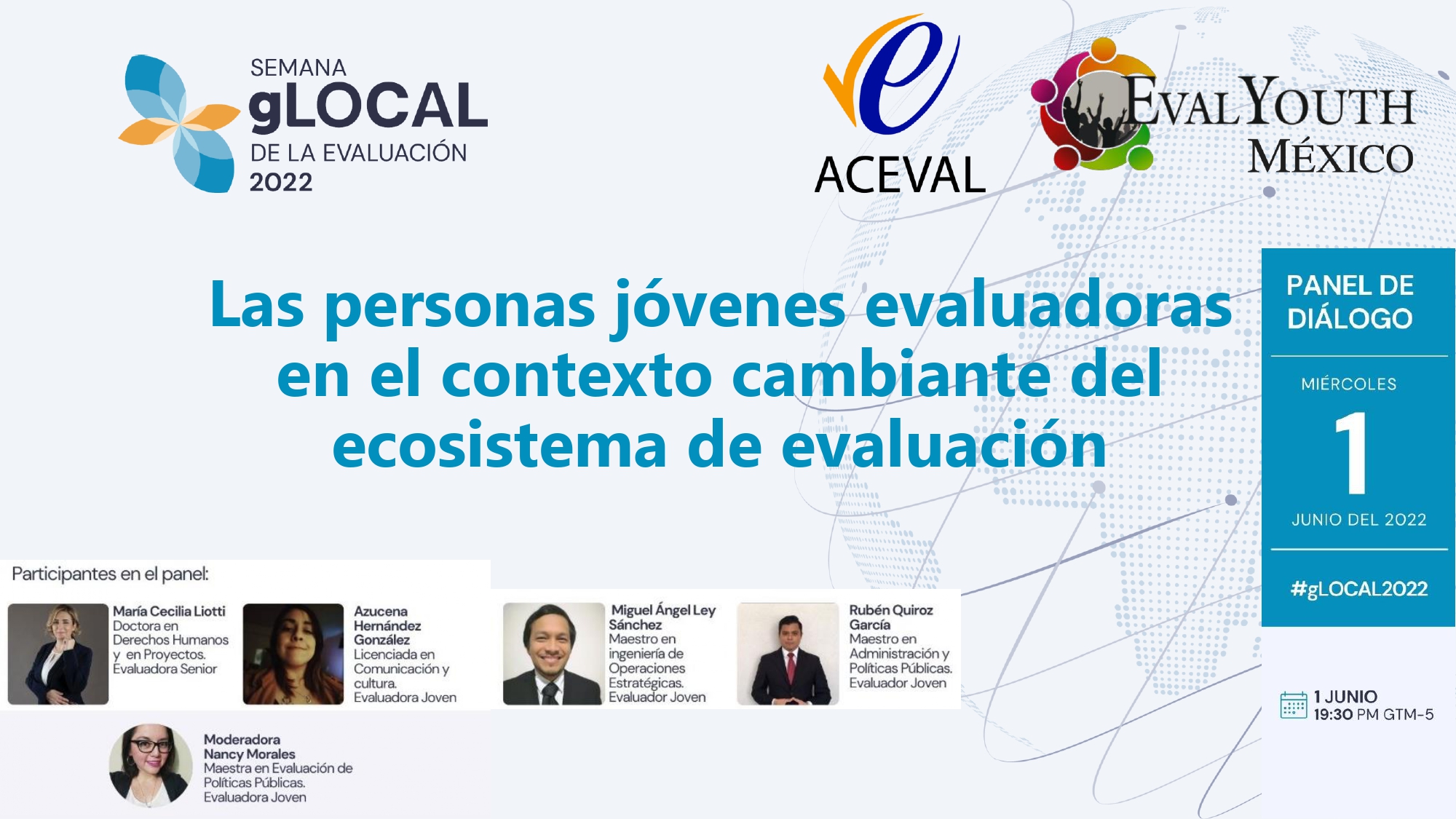 Panel donde se abordarán temas referentes a las experiencias que han tenido personas jóvenes evaluadoras para colaborar en equipos de evaluación. De igual forma se contará con el enfoque de personas evaluadoras senior que hayan contado con el apoyo/colaboración de personas jóvenes durante evaluaciones. Ambas partes contarán con la perspectiva de género. La finalidad del panel es visibilizar los obstáculos y el contexto del ecosistema de evaluación para los jóvenes recién egresados o con poca experiencia en evaluación.