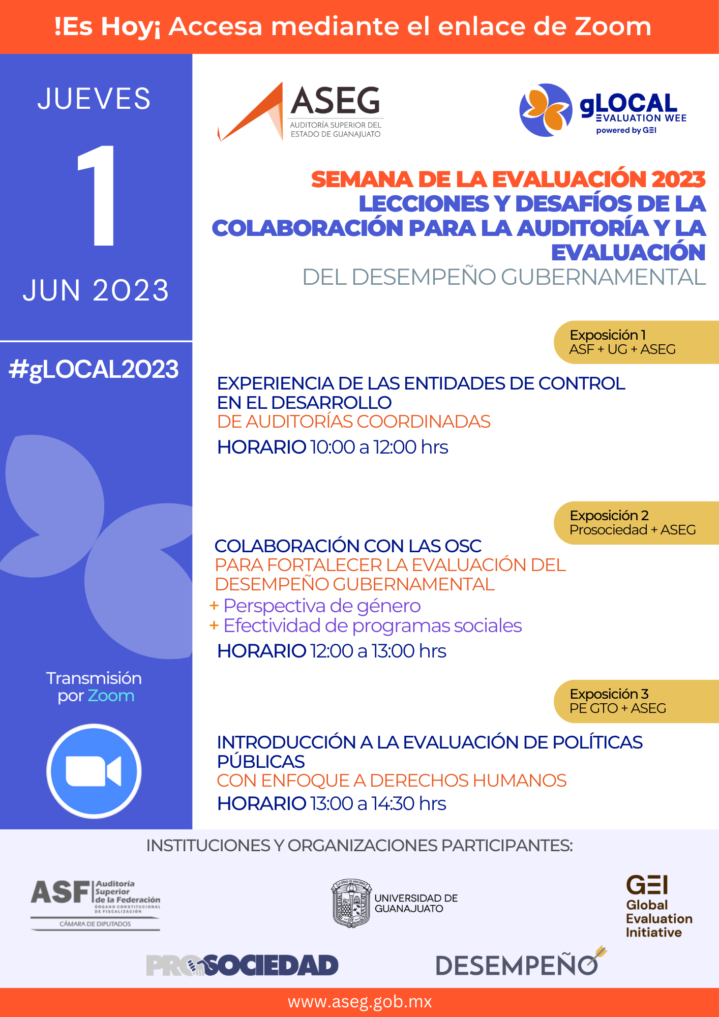 A ese respecto, y con el propósito de reconocer e impulsar la práctica de las auditorías de desempeño como una herramienta de la fiscalización para la evaluación de políticas y programas públicos, se ha determinado que la participación de ASEG en 2023, centre sus esfuerzos en una diversidad de actividades, bajo la jornada denominada: «Lecciones y desafíos de la colaboración para la evaluación y la auditoría del desempeño gubernamental».