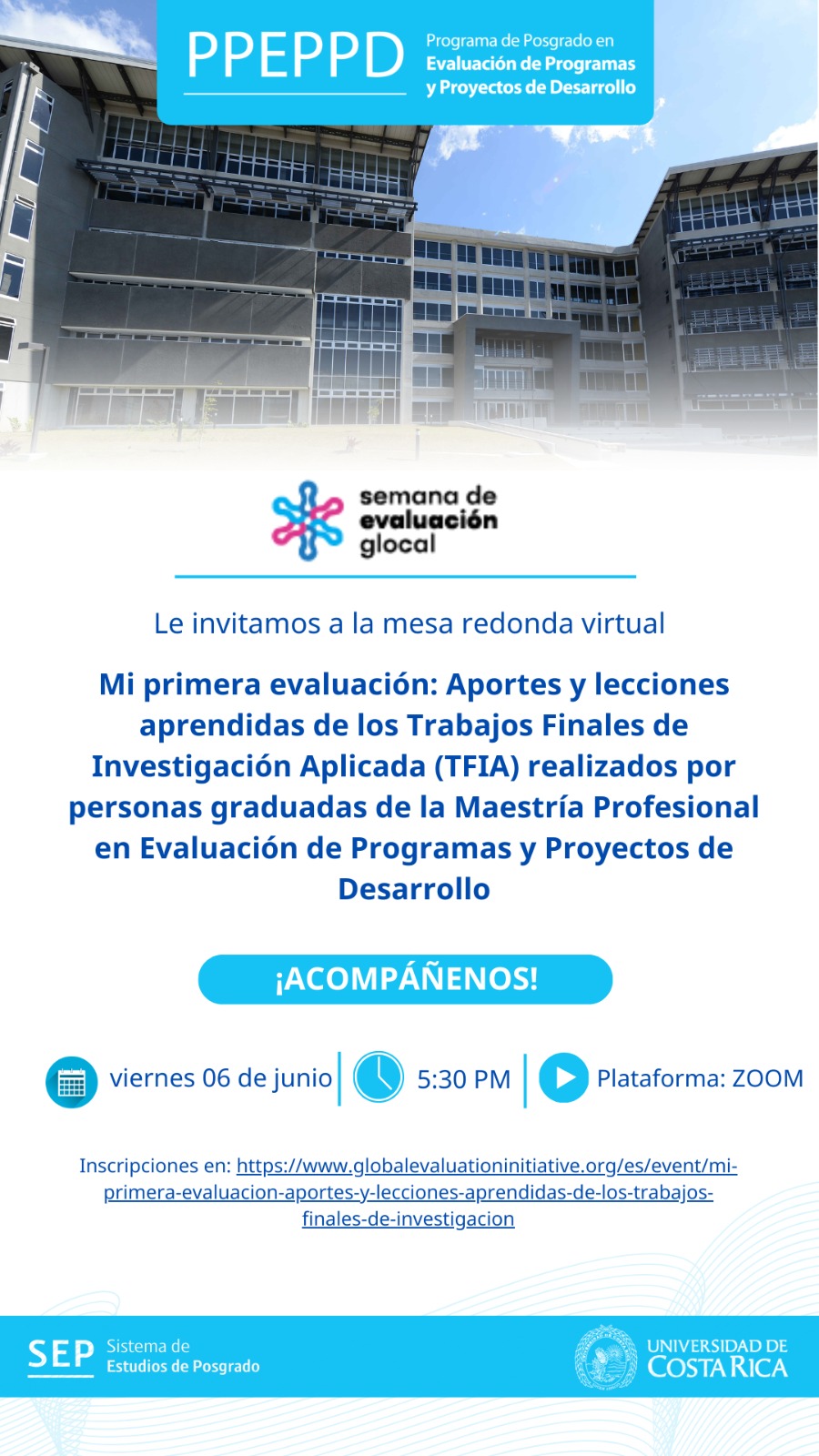 Esta mesa redonda constituye en un espacio de diálogo e intercambio de aportes y lecciones aprendidas de las primeras evaluaciones realizadas por nuestras personas graduadas de la Maestría Profesional en Evaluación de Programas y Proyectos de Desarrollo, perteneciente al Sistema de Estudios de Posgrado (SEP) de la Universidad de Costa Rica (UCR).