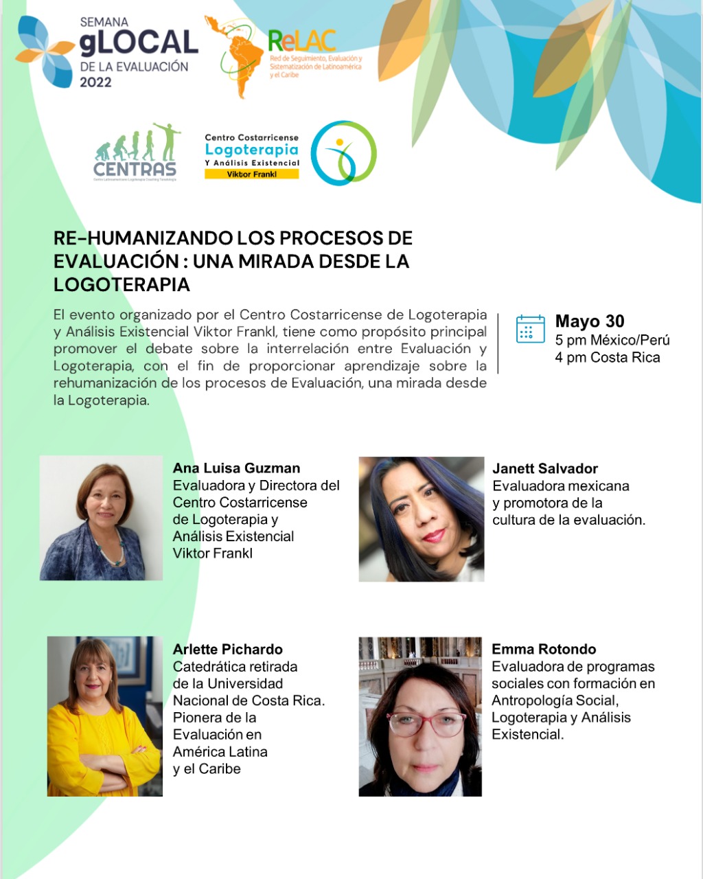 El evento organizado por el Centro Costarricense de Logoterapia y Análisis Existencial Viktor Frankl, tiene como propósito principal promover el debate sobre la interrelación entre Evaluación y Logoterapia, con el fin de proporcionar aprendizaje sobre la rehumanización de los procesos de Evaluación, una mirada desde la Logoterapia.