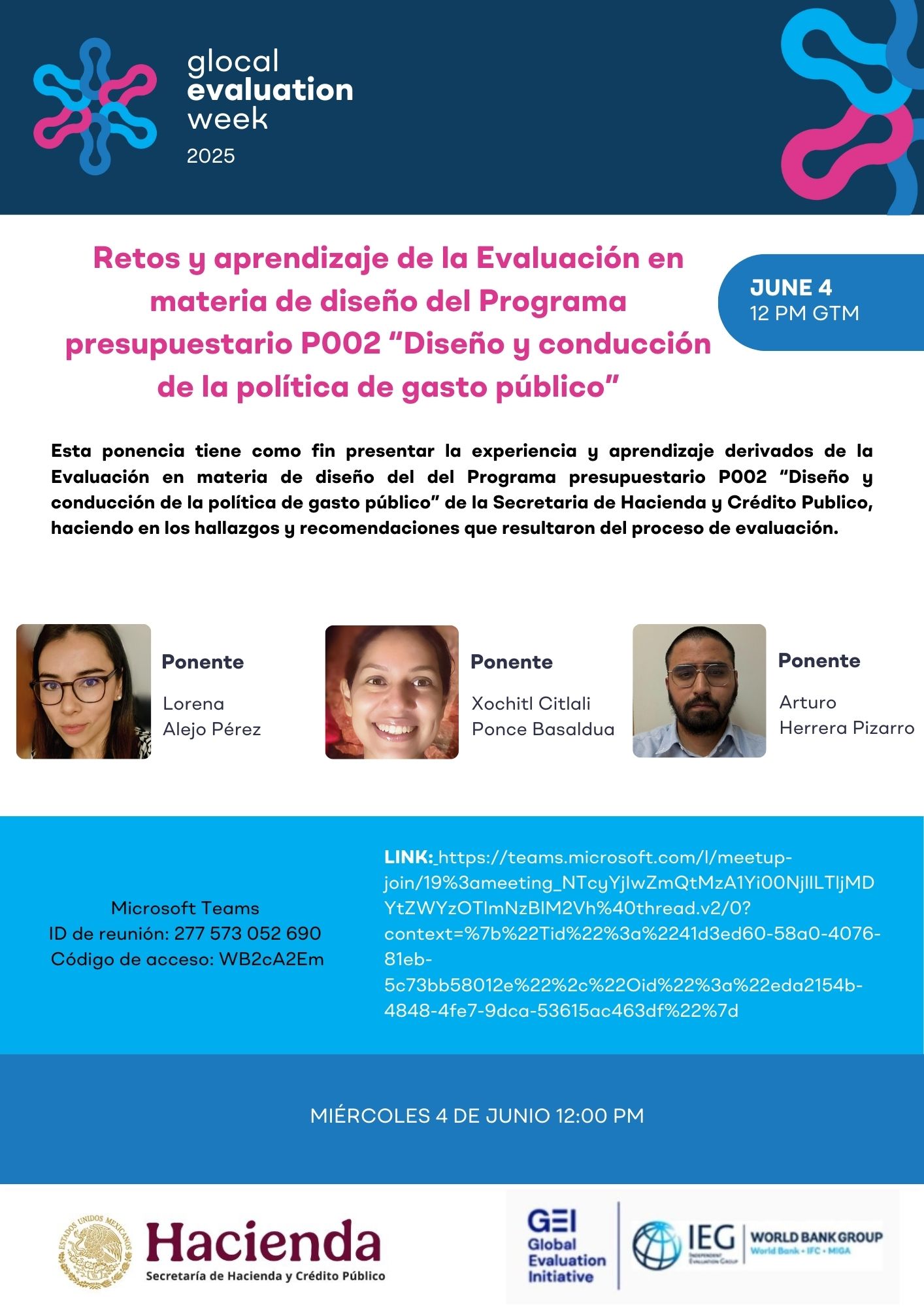 Esta ponencia tiene como fin presentar la experiencia y aprendizaje derivados de la Evaluación en materia de diseño del del Programa presupuestario P002“Diseño y conducción de la política de gasto público” de la Secretaria de Hacienda y Crédito Publico, haciendo en los hallazgos y recomendaciones que resultaron del proceso de evaluación.