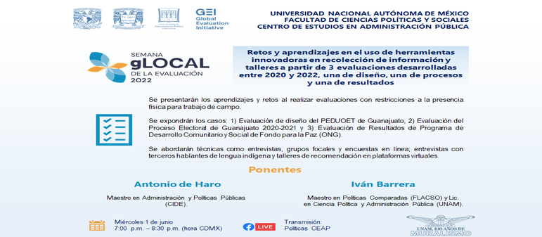 Se presentarán los aprendizajes y retos al realizar evaluaciones con restricciones a la presencia física para trabajo de campo. Se expondrán los casos: 1) Evaluación de diseño del PEDUOET de Guanajuato, 2) Evaluación del Proceso Electoral de Guanajuato 2020-2021 y 3) Evaluación de Resultados de Programa de Desarrollo Comunitario y Social de Fondo para la Paz (ONG). Se abordarán técnicas como entrevistas, grupos focales y encuestas en línea; entrevistas con terceros hablantes de lengua indígena y talleres de recomendación en plataformas virtuales. La sesión culminará con preguntas del público.