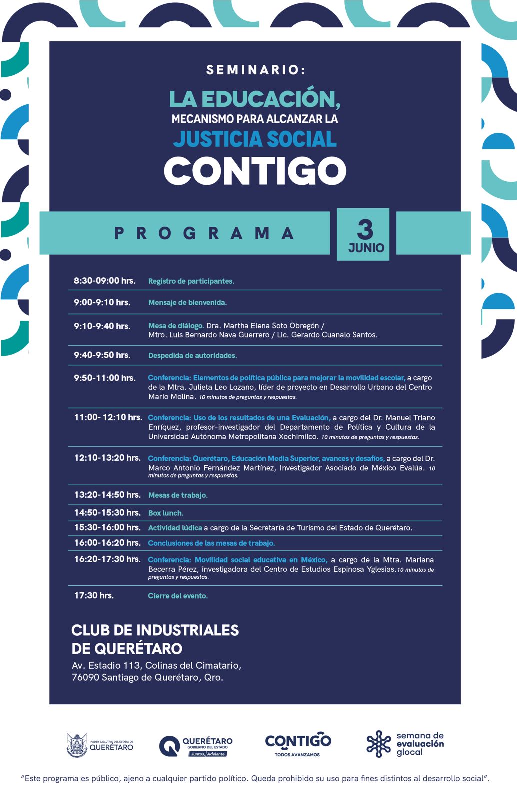 En el marco de la Semana de la Evaluación 2025 que convoca gLOCAL- Iniciativa Global de Evaluación (GEI), la Secretaría de Desarrollo Social (SEDESOQ), en conjunto con la Secretaría de Educación (SEDEQ), ambas pertenecientes al Poder Ejecutivo del Estado de Querétaro, organizan el Seminario “La educación, mecanismo para alcanzar la justicia social en Querétaro”.