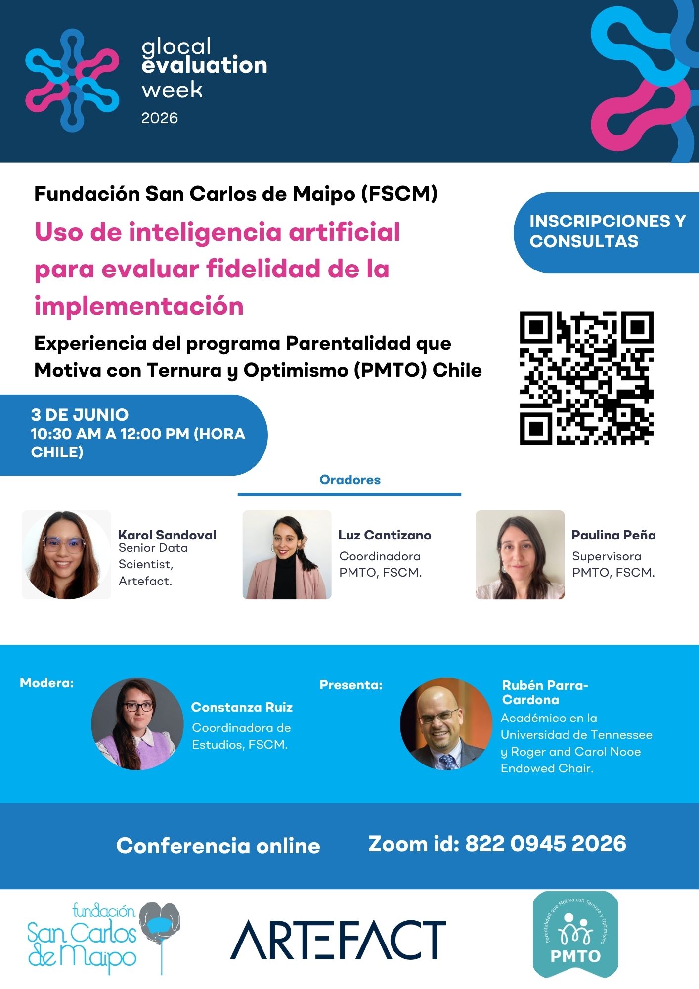 | Paulina Peña | Supervisora Programa Parentalidad que Motiva con Ternura y Optimismo (PMTO), Fundación San Carlos de Maipo | Psicóloga. | Psicóloga y terapeuta familiar. Supervisora en la Fundación San Carlos de Maipo, con experiencia en implementación y supervisión del programa de parentalidad PMTO, además de entrenamiento de evaluadores de fidelidad del programa. |