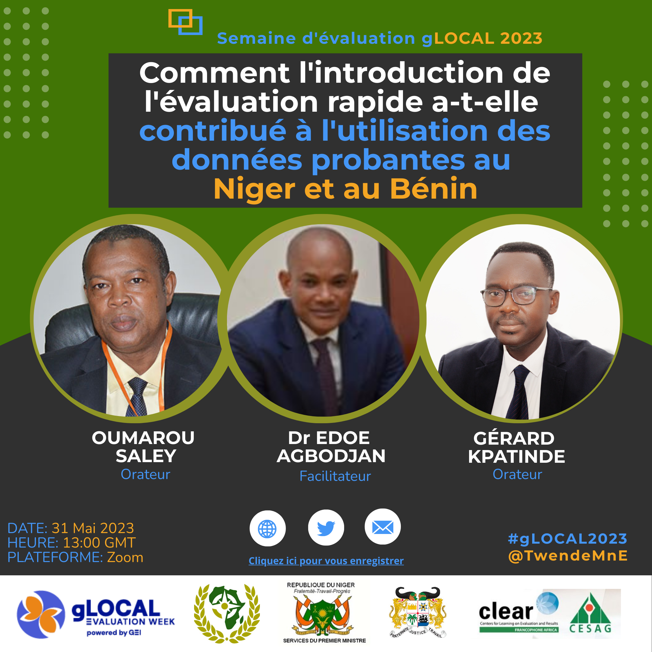 | Oumarou SALEY | Mr | Haut Commissaire au S&E du Haut Commissariat à la Modernisation de l'Etat (HCME), République du Niger |
