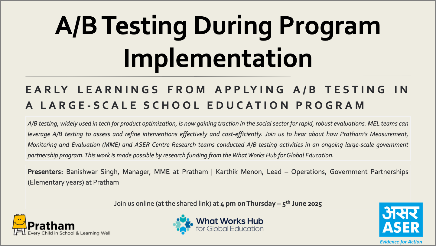 A/B testing, widely used in tech for product optimization, is now gaining traction in the social sector for rapid, robust evaluations. MEL teams can leverage A/B testing to assess and refine interventions effectively and cost-efficiently. This Master Class explores its initial application in a large-scale school education program, sharing Pratham’s motivations, approach, and key learnings from early A/B Testing rounds. Participants will see how A/B testing enhances program impact, identifying what works and fostering data-driven decisions.