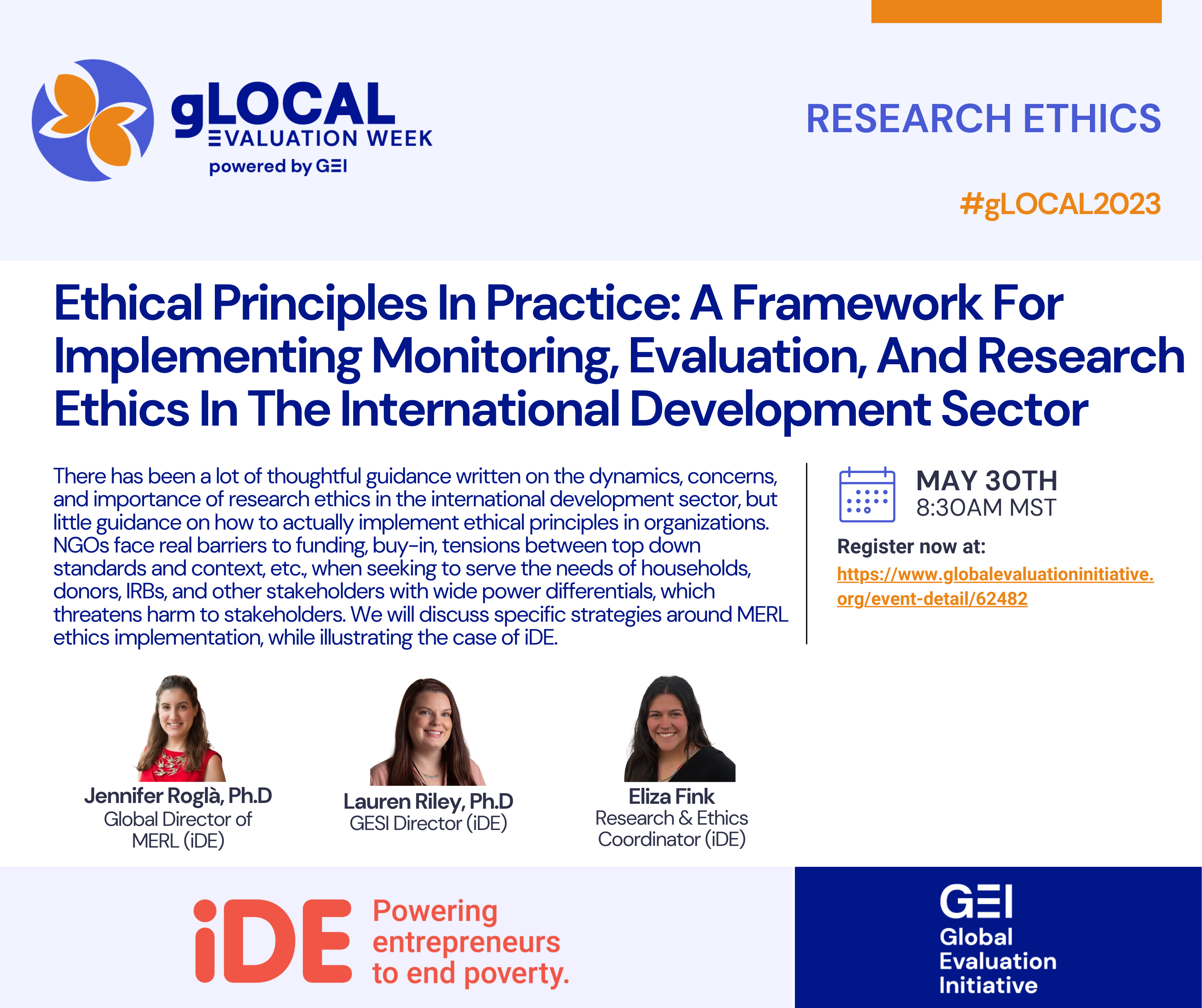 There has been a lot of thoughtful guidance written on the dynamics, concerns, and importance of research ethics in the international development sector, but little guidance on how to actually implement ethical principles in organizations. NGOs face real barriers to funding, buy-in, tensions between top down standards and context, etc., when seeking to serve the needs of households, donors, IRBs, and other stakeholders with wide power differentials, which threatens harm to stakeholders. We will discuss specific strategies around MERL ethics implementation, while illustrating the case of iDE.