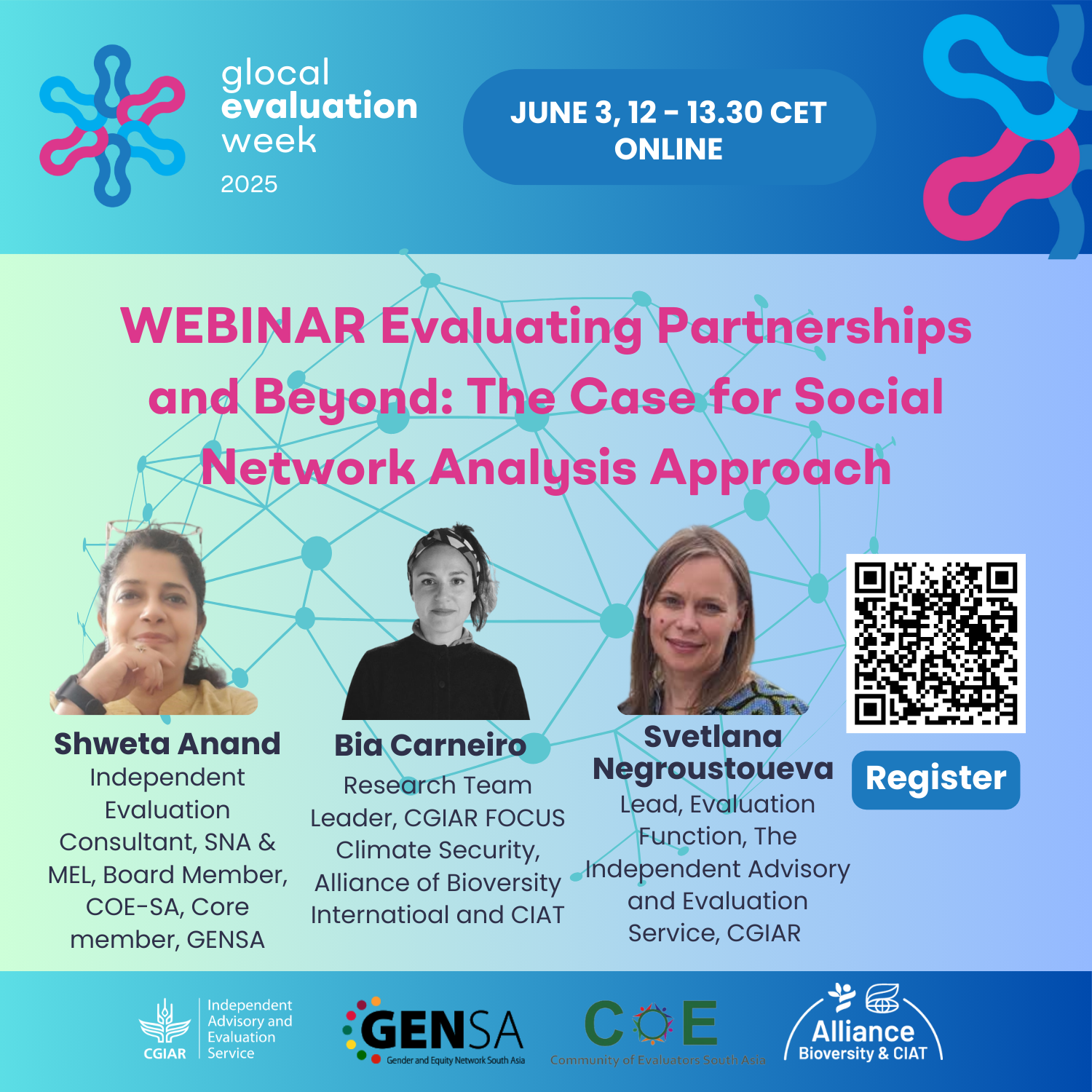 - In partnership with: Bia Carnero, Research Team Leader, CGIAR , Shweta Anand, PhD Social Network Analysis & MEL Analyst, Community of Evaluators - South Asia (COE-SA) Core Member, GENSA Former Assistant Professor, Department of Development Communication & Extension, University