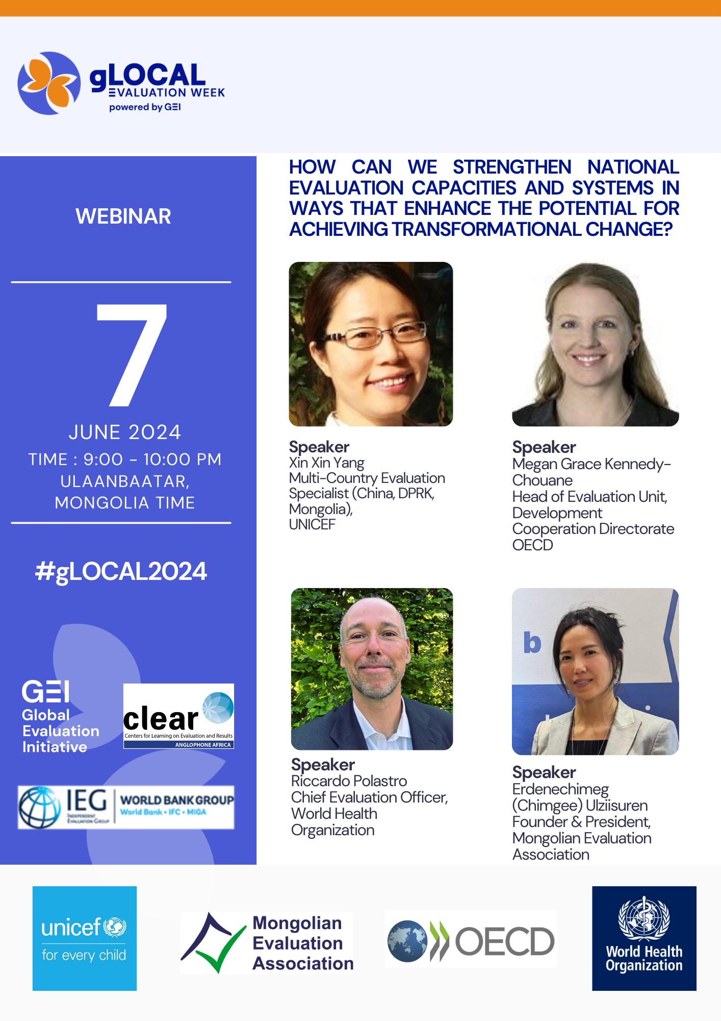 In this webinar, we will have government officials from China and Mongolia who will emphasize the value of evaluation in their respective contexts. In addition, a winning team of the 2nd Mongolian Evaluation Case Competition will join the webinar to discuss how they applied the OECD/DAC criteria in the competition.