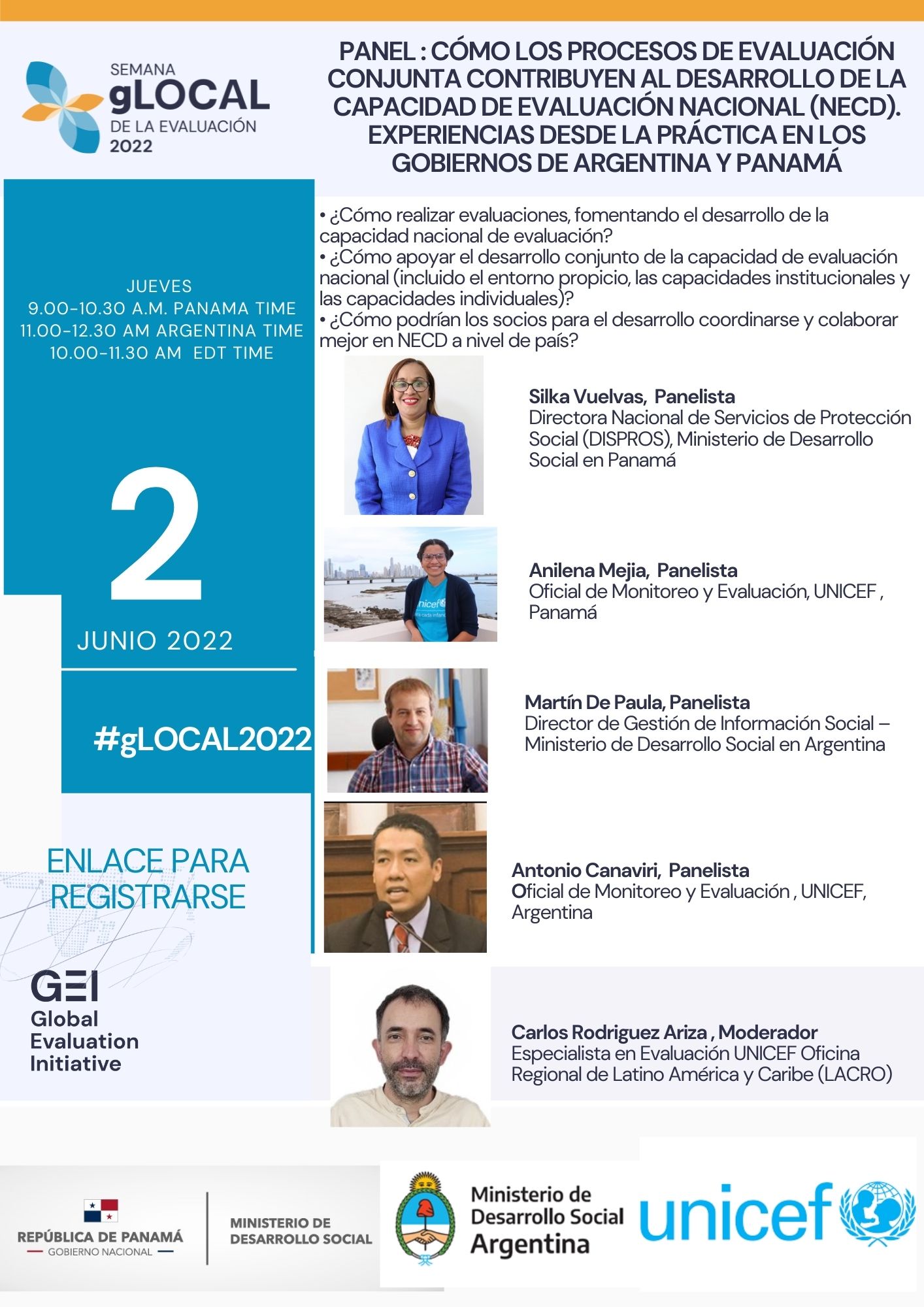 • Panama panelists: From the Government of Panama, we will have the participation of the Directorate of Social Protection Services (DISPROS) of the Ministry of Social Development (MIDES), together with the UNICEF Panama M&E officer