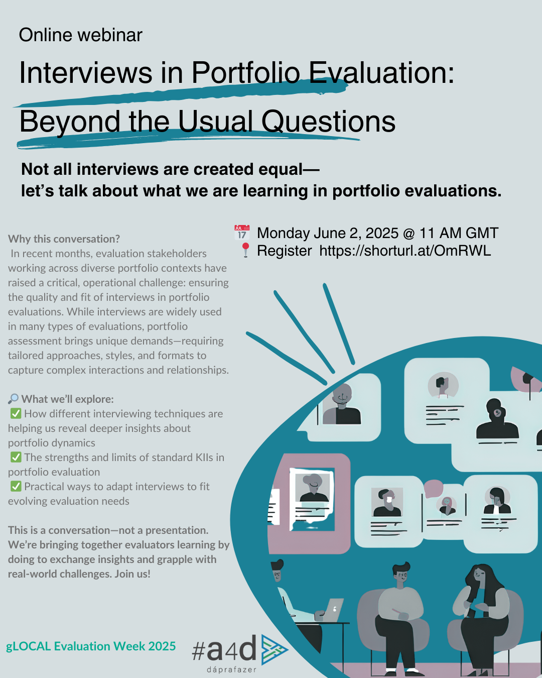 Portfolio evaluation requires a mosaic of methods, yet one tool remains central but often overlooked: the interview. Where interactions shape outcomes and time horizons shift, not all interviews serve the same purpose. How can diverse techniques reveal relationships critical to portfolio analysis? Join a conversation with colleagues learning by doing as they explore how specific approaches, styles, and formats of interviews can unlock unique insights—beyond standard KIIs—and discuss the mechanics of this evolving tool in complex intervention assessments.