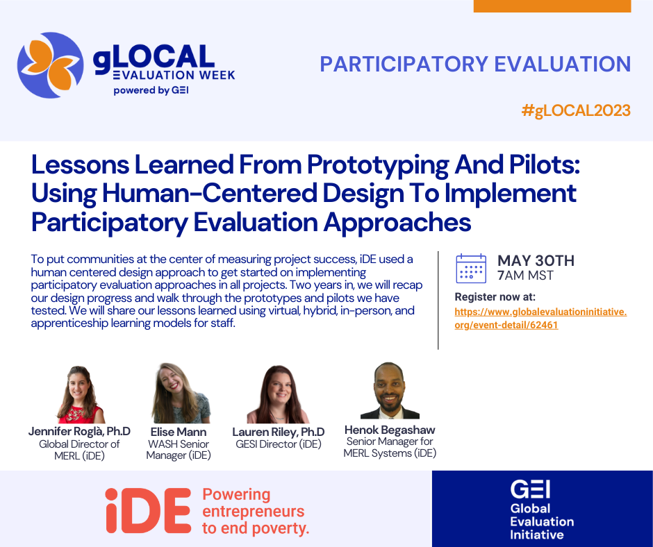 To put communities at the center of measuring project success, iDE used a human centered design approach to get started on implementing participatory evaluation approaches in all projects. Two years in, we will recap our design progress and walk through the prototypes and pilots we have tested. We will share our lessons learned using virtual, hybrid, in-person, and apprenticeship learning models for staff and how to fund and begin scale implementation across all iDE country programs.