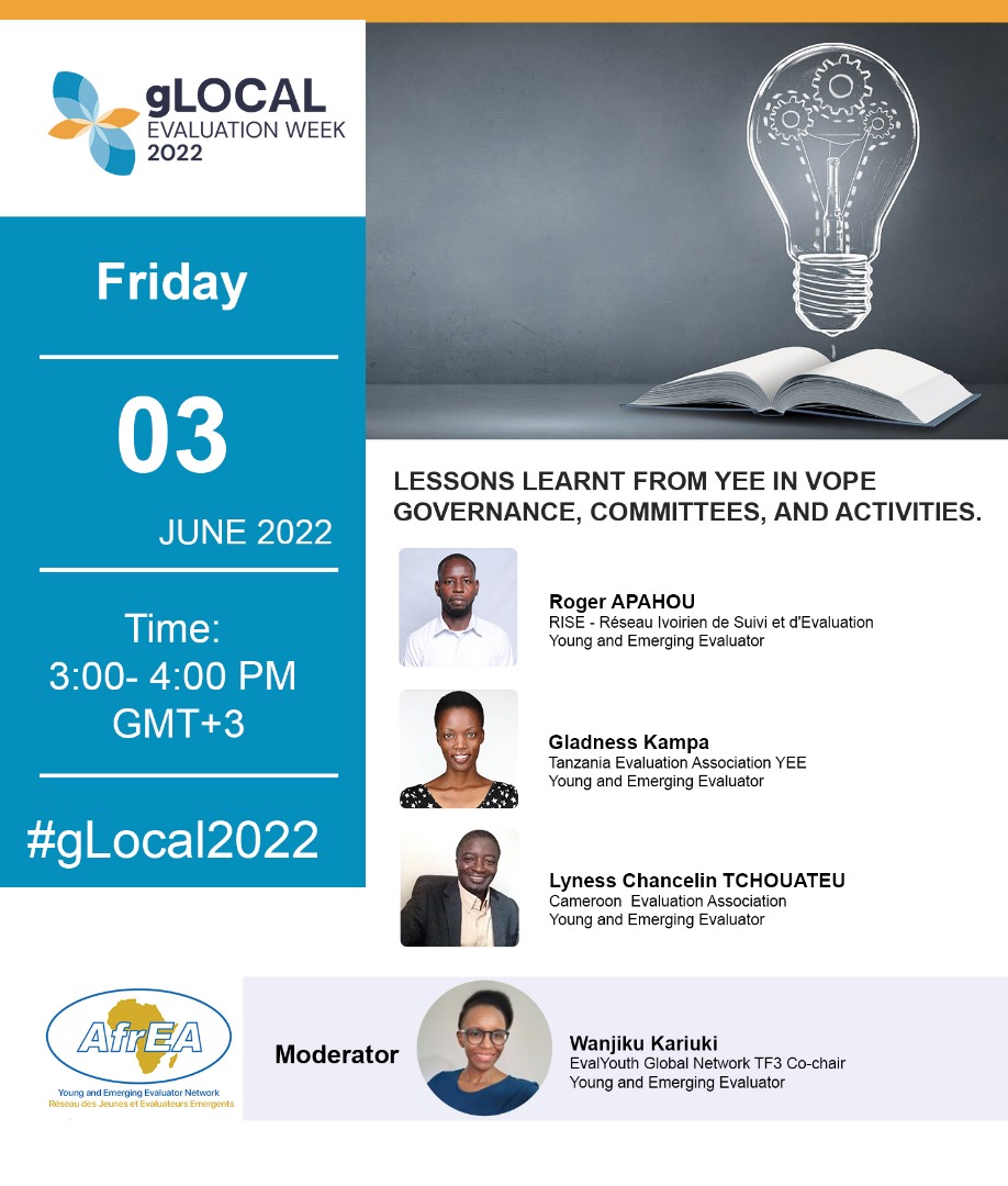 | Lyness Chancelin TCHOUATEU | Young and Emerging Evaluator | Lyness Chancelin TCHOUATEU has a master degree in monitoring and evaluation. He is a Project Manager and M&E. he has experience and expertise in Project Management, Monitoring, and Evaluation. Experience gained from different projects that he worked on. He works as an independent consultant. |