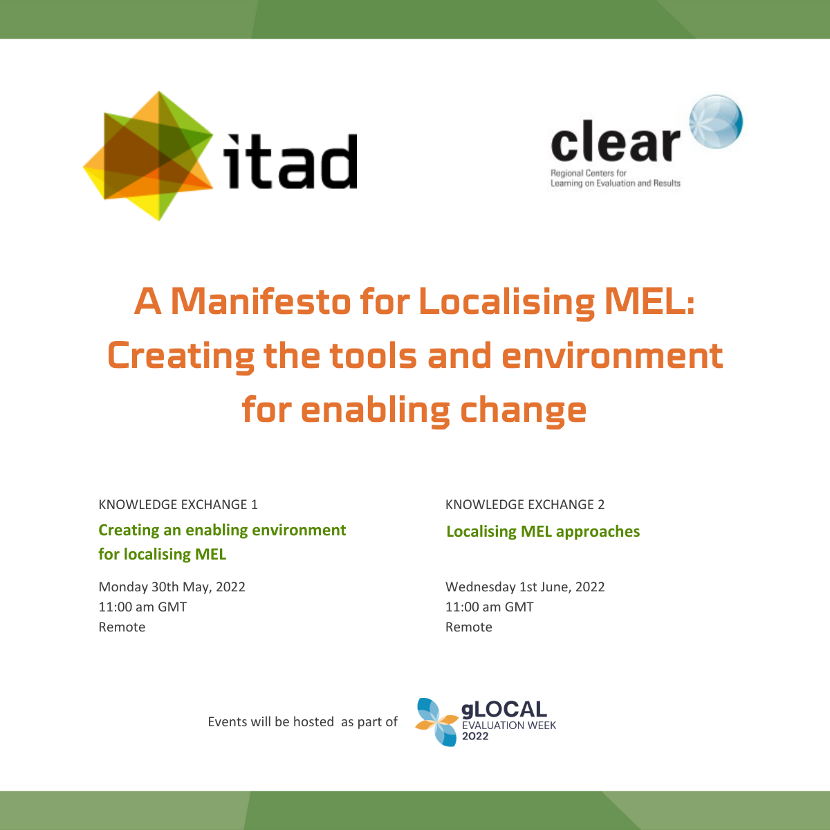 At the end of the second event, Itad and CLEAR will commit to consolidate the goals, learnings and insights emerged from both sessions into a manifesto to circulate among the participants of the event. The manifesto could also include references to practical tools and approaches to further the localisation of MEL.