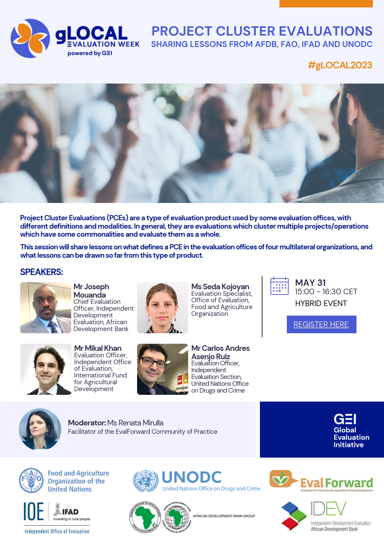 Project Cluster Evaluations (PCEs) are a type of evaluation product used by some evaluation offices, with different definitions and modalities. In general, they are evaluations which cluster multiple projects/operations which have some commonalities and evaluate them as a whole. This session will share lessons on what defines a PCE in the evaluation offices of four multilateral organizations, and what lessons can be drawn so far from this type of product.