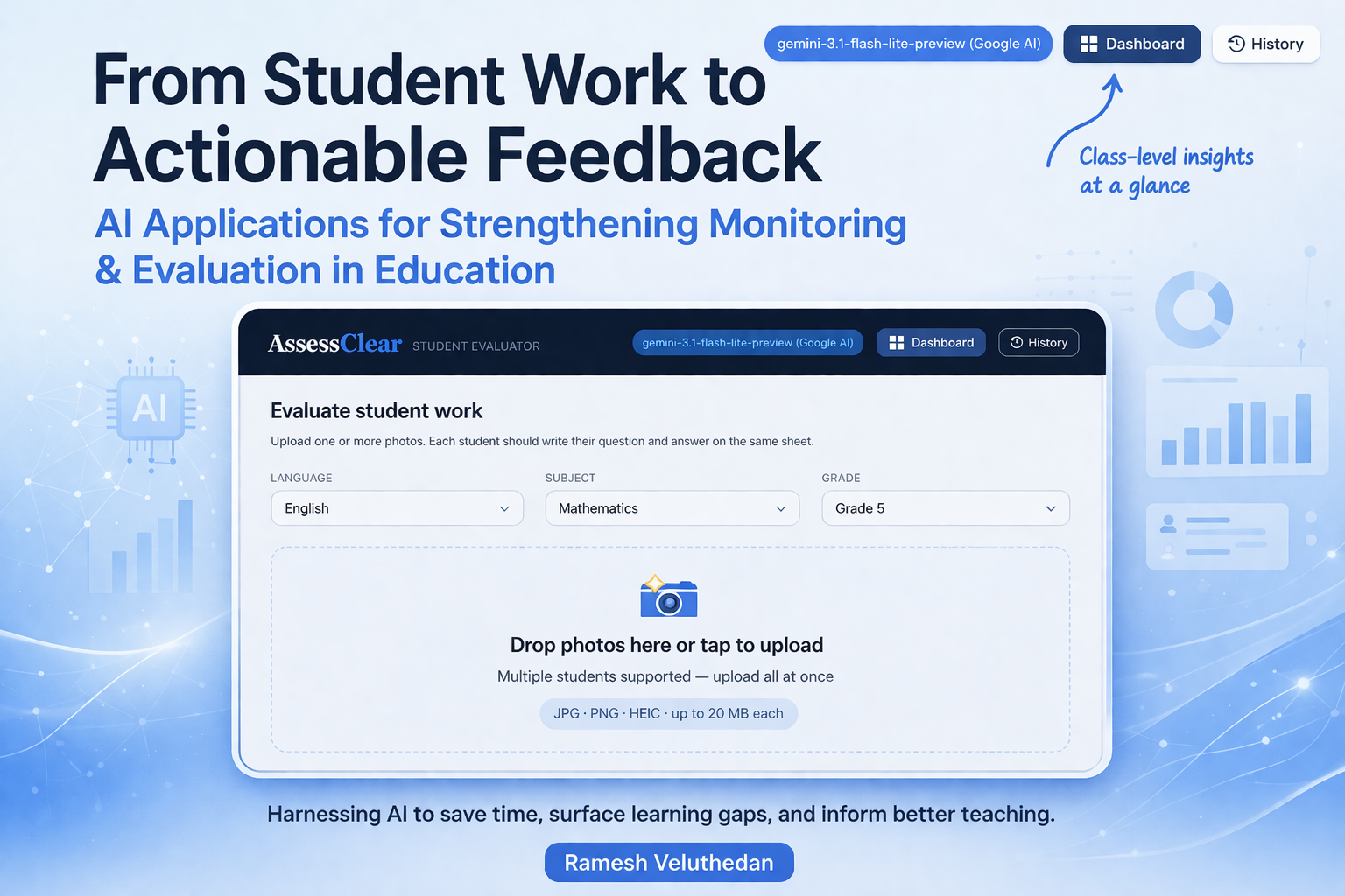 Ramesh Veluthedan Project Manager, MEL Ramesh Veluthedan is an AI for Education practitioner with experience in monitoring, evaluation, and learning (MEL) systems. He builds exploratory AI applications to support teachers and improve classroom practice, focusing on actionable insights and multilingual contexts.