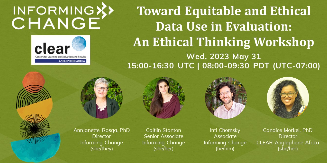Informing Change recently partnered with the David and Lucile Packard Foundation on a Data Ethics Guidebook and Toolkit, offering guidance and tools to evaluation staff and practitioners for tackling issues from design to use and distribution, and stories from the field illustrating real-world dilemmas. This online workshop will introduce attendees to the tools (including alternatives to Institutional Review Boards, guidelines for ethical collection of demographic data, and an ethical thinking framework) and invite them to discuss issues that often arise in evaluation and research.