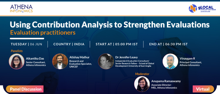 Athena Infonomics proposes a panel discussion on contribution analysis to provide a comprehensive exploration of this methodology, covering its planning, execution, learnings, challenges, and prospects in policy interventions or any intervention to which change cannot be solely attributed.