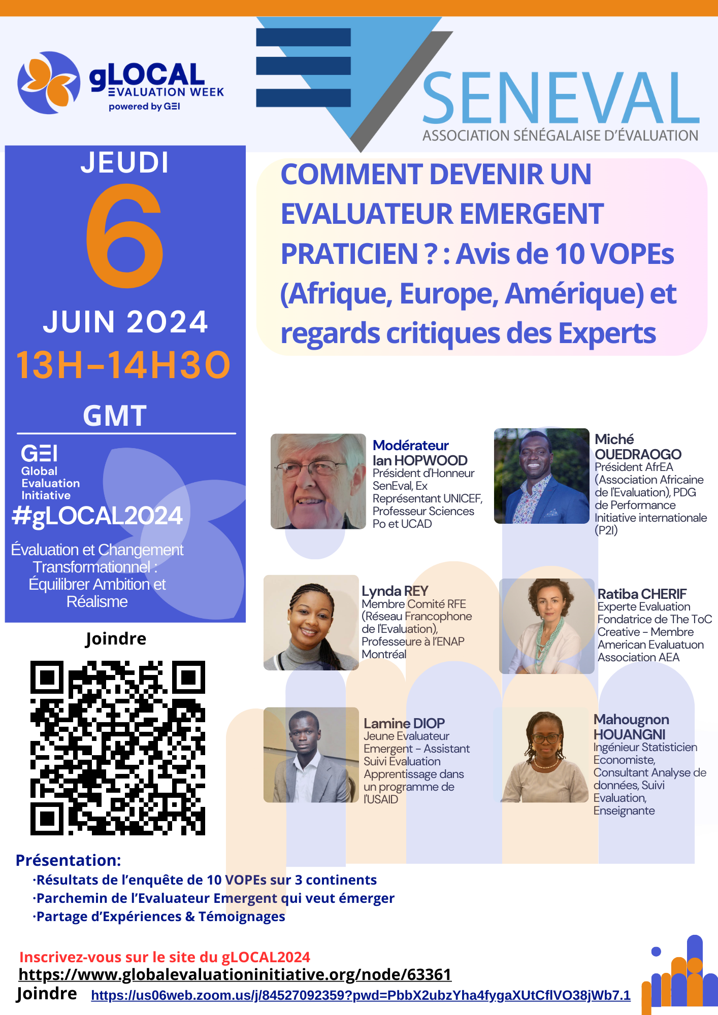 La présentation des résultats de l'enquête "COMMENT DEVENIR UN EVALUATEUR EMERGENT PRATICIEN ?" se fera par Mahougnon HOUANGNI (YEE-SenEval) sous la modération de M. Ian HOPWOOD (Président d'Honneur de SenEval).