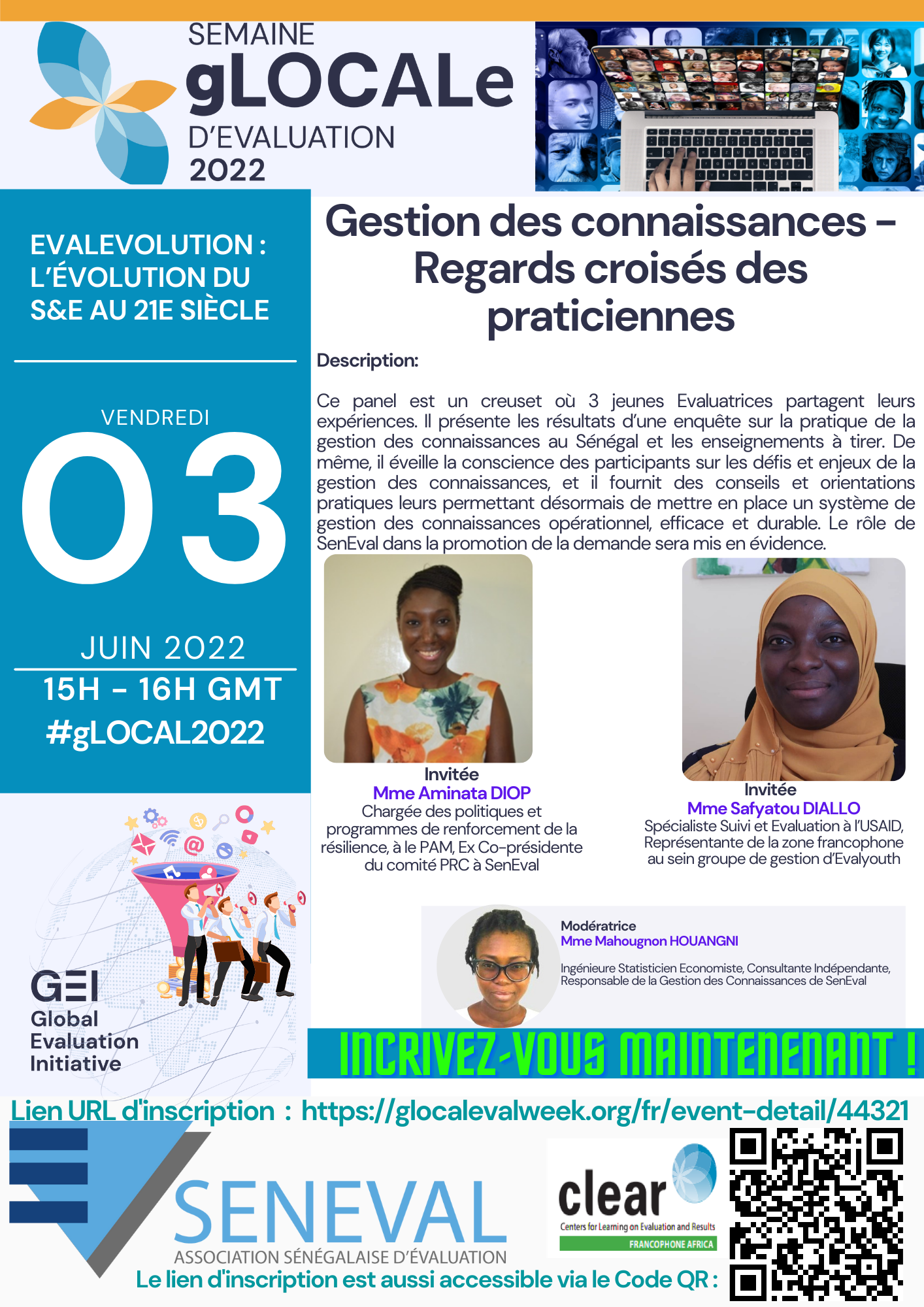 Ce panel est un creuset où 3 jeunes Evaluatrices partagent leurs expériences. Il présente les résultats d’une enquête sur la pratique de la gestion des connaissances au Sénégal et les enseignements à tirer. De même, il éveille la conscience des participants sur les défis et enjeux de la gestion des connaissances, et il fournit des conseils et orientations pratiques leurs permettant désormais de mettre en place un système de gestion des connaissances opérationnel, efficace et durable. Le rôle de SenEval dans la promotion de la demande sera mis en évidence.