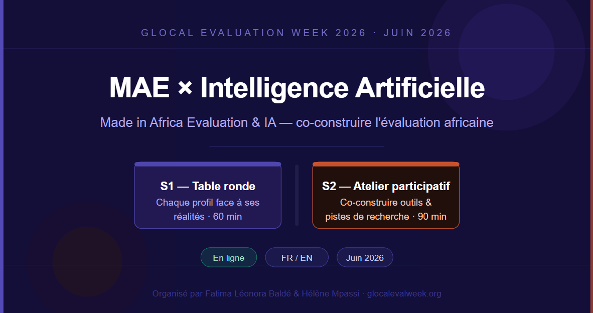 Atelier participatif de clôture du bloc MAE × IA. En 5 breakout rooms organisées par profil professionnel, les participant·es co-construisent une cartographie des besoins en outils, des lacunes de capacités et des questions de recherche prioritaires pour la communauté M&E africaine à l'ère de l'IA. Les outputs, policy document et agenda de recherche MAE × IA seront partagés avec la communauté Glocal, les ANE et le Réseau Evaluation dans son ensemble.