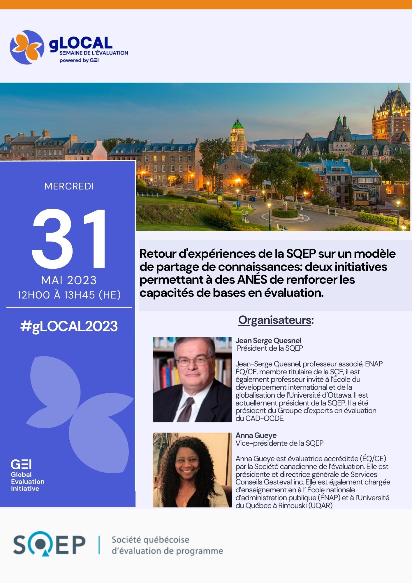 | Jean Serge Quesnel | Président de la SQEP | Jean-Serge Quesnel, professeur associé, ENAP ÉQ/CE, membre titulaire de la SCE, il est également professeur invité à l’École du développement international et de la globalisation de l’Université d’Ottawa. Il est actuellement président de la SQEP. Il a été président du Groupe d'experts en évaluation du CAD-OCDE. |