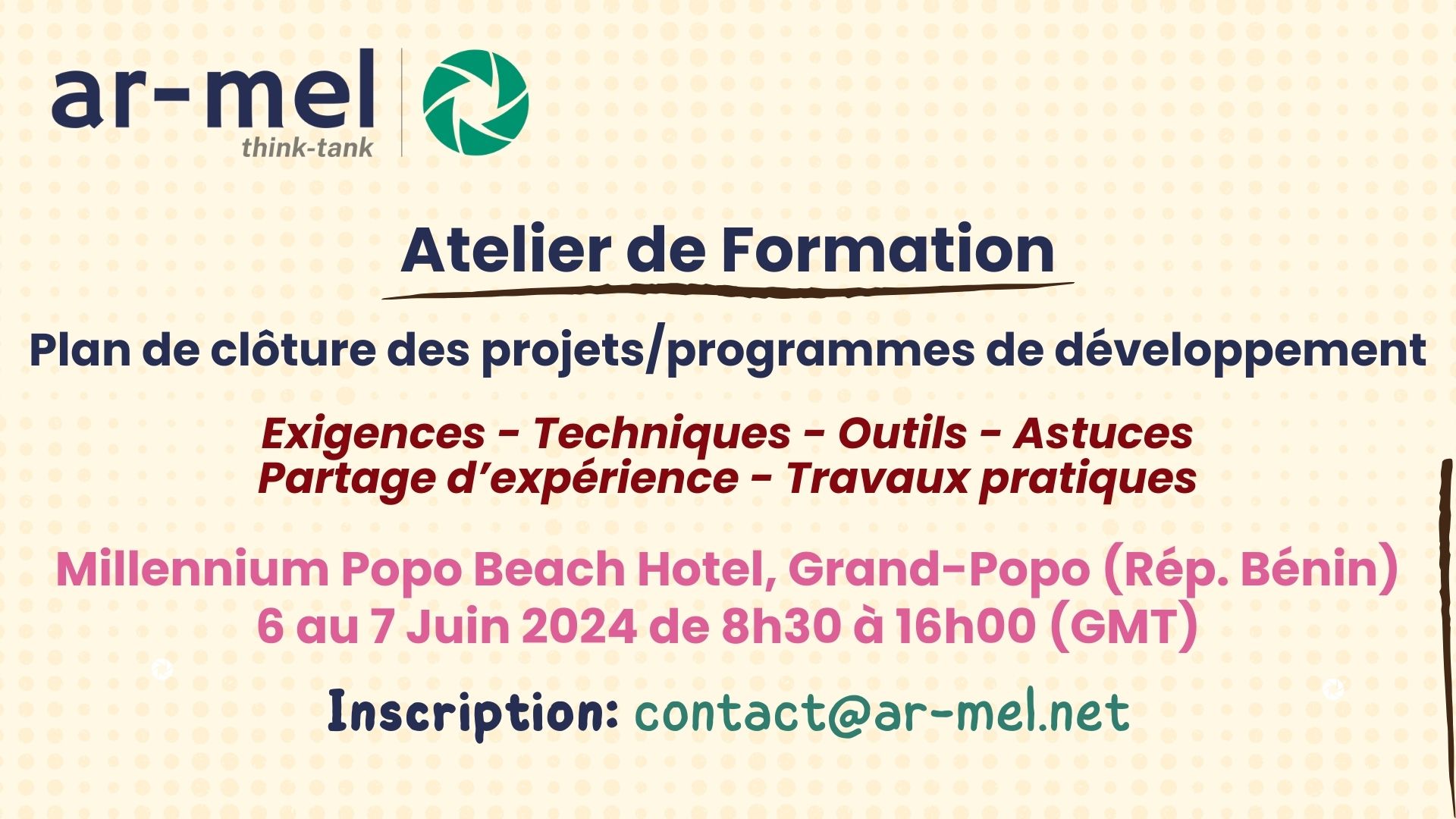 Dans le cadre de la gLOCAL Evaluation Week 2024, la plateforme ar-mel, en partenariat avec le Centre d'Études Sociologiques et de Science Politique (CESPo) de l'Université d'Abomey-Calavi, le Réseau Béninois de Suivi et Evaluation (ReBSEv) et, SECODEV Consulting, organise un atelier de formation sur le « Plan de Clôture des Projets/Programmes ».