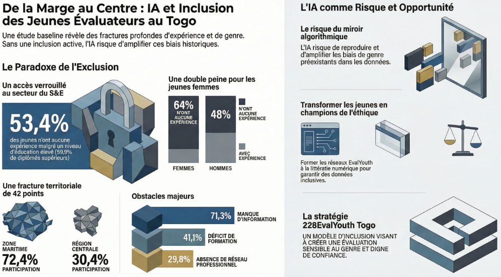 Cette présentation, portée par AGDEN (African Gender and Development Evaluators Network) et 228EvalYouth Togo, s'inscrit directement dans le thème « Évaluation, Preuves et Confiance à l'ère de l'IA ». Elle s'appuie sur les résultats de la première étude baseline nationale conduite au Togo auprès de 442 jeunes dans les cinq régions administratives du pays, pour explorer comment le renforcement des capacités des jeunes évaluateurs peut soutenir une évaluation sensible au genre, éthique et digne de confiance à l'ère de l'IA.