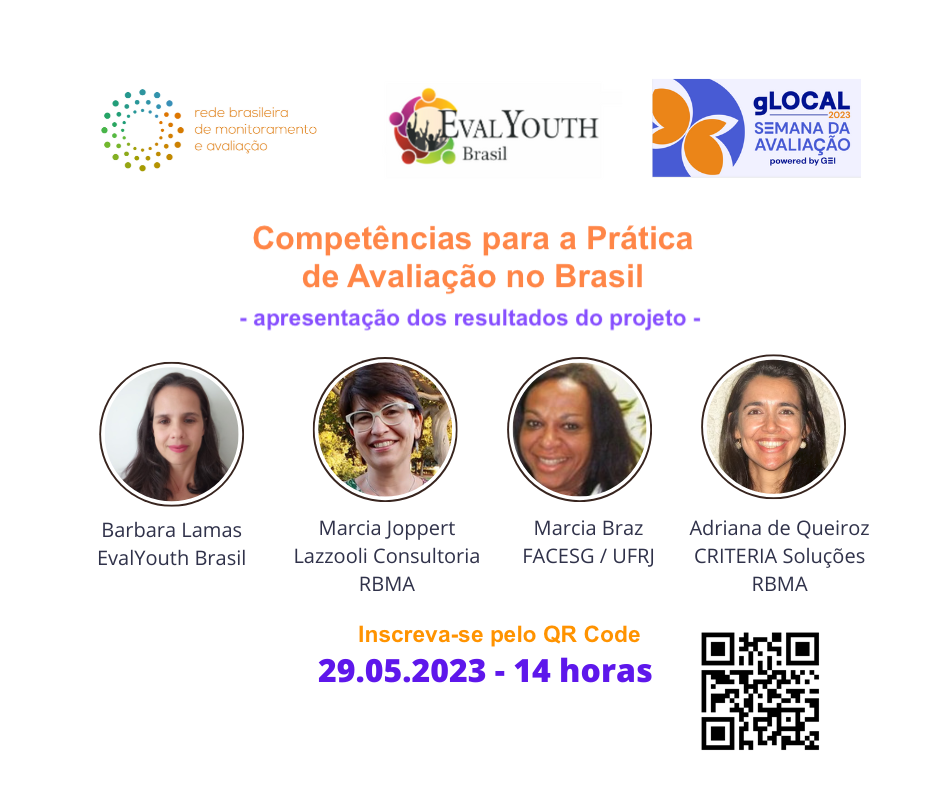 Seguindo uma prática internacional, a RBMA tem buscado contribuir para a profissionalização da avaliação no Brasil, em consonância com o contexto nacional. Em parceria com a EvalYouth Brasil, tem conduzido desde 2022 um processo de pesquisa e consultas para a correta identificação e compreensão das competências necessárias para se realizar, gerir ou contratar avaliações no Brasil. Este painel tem por objetivo apresentar o trabalho realizado e coletar contribuições que auxiliarão na validação do mapa de competências.