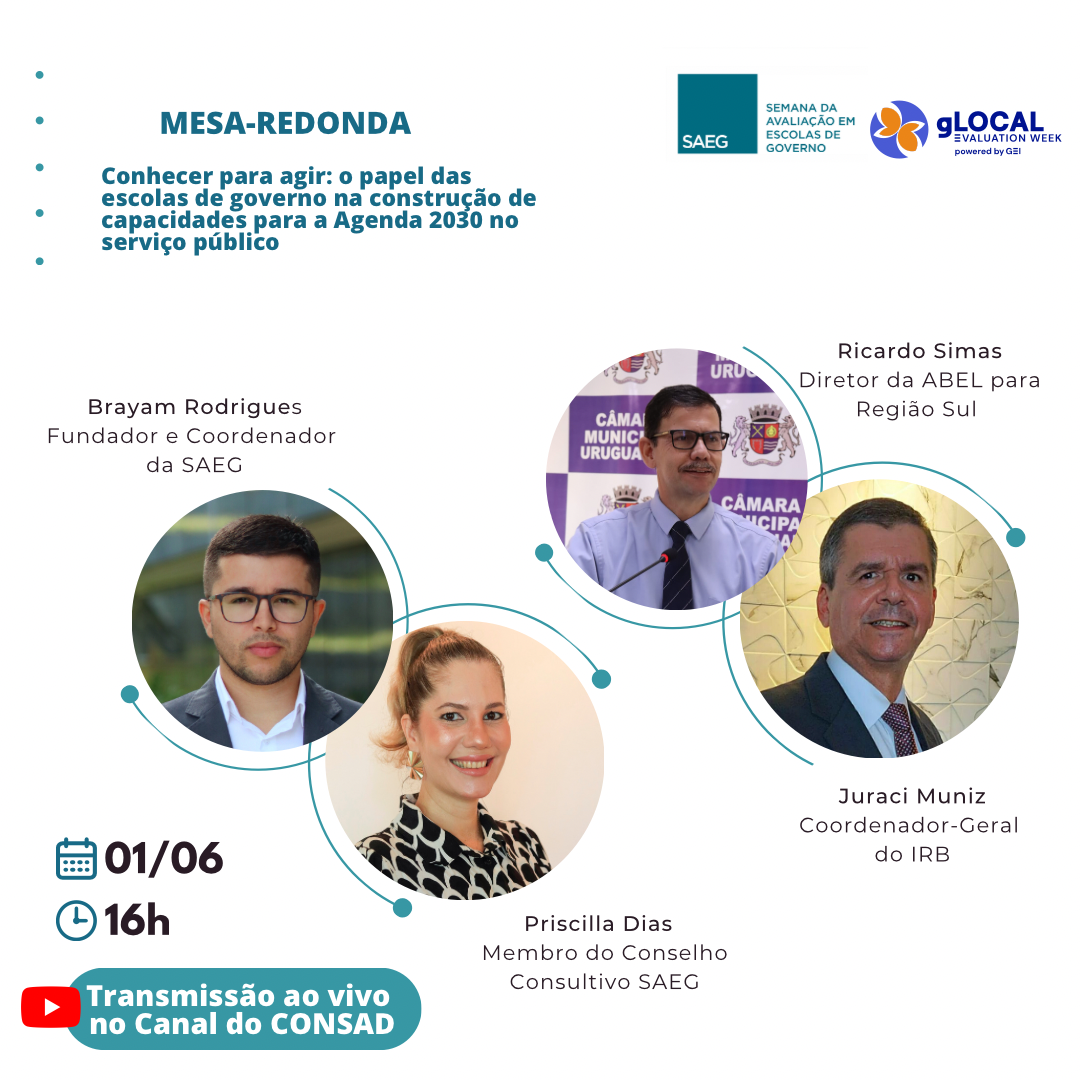 Este é um dos sete eventos da 6ª Semana da Avaliação em Escolas de Governo (SAEG) – que tem por tema-geral “Cooperação para a capacitação e avaliação da Agenda 2030 no serviço público” e, tem por objetivo: