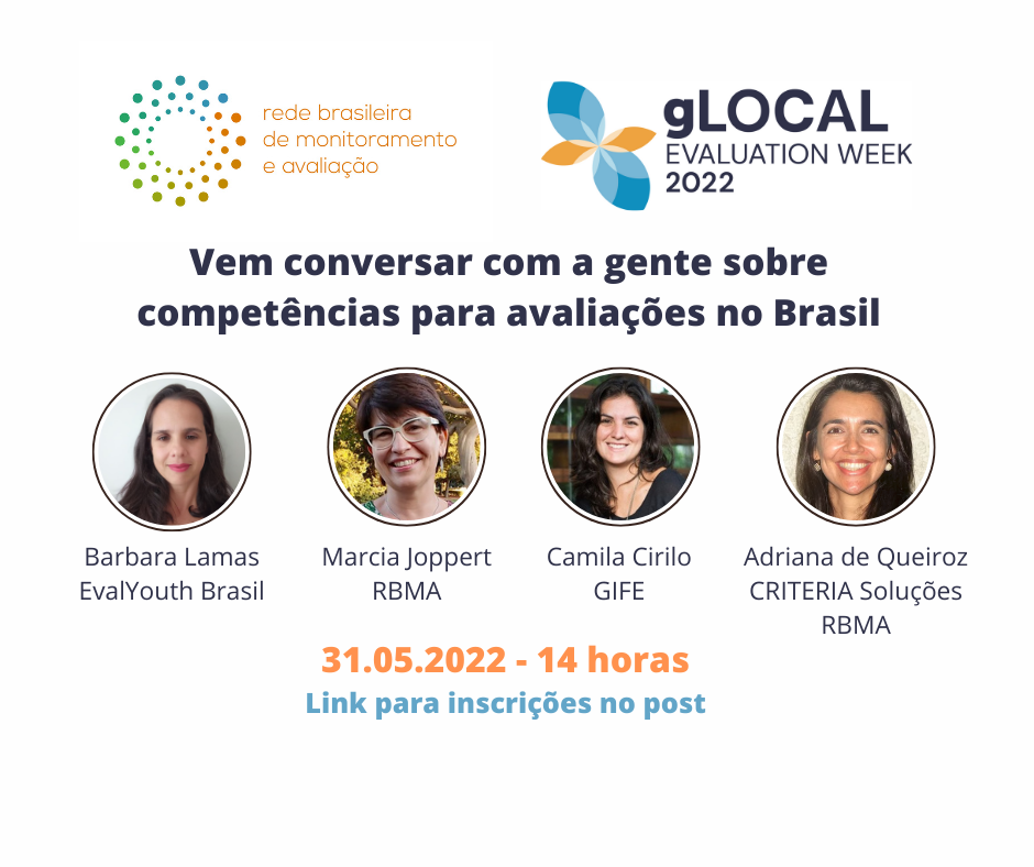 A correta identificação e compreensão das competências e habilidades necessárias para se realizar, gerir ou contratar avaliações têm relação direta com a qualidade dessas avaliações. Percebendo a existência desta lacuna no Brasil, a Rede Brasileira de Monitoramento e Avaliação e a EvalYouth Brasil, em parceria com o Grupo de Institutos, Fundações e Empresas, decidiram promover o debate sobre as competências brasileiras para avaliações. Este produto terá grande relevância para um campo cujo interesse por formação e a demanda por serviços são crescentes.