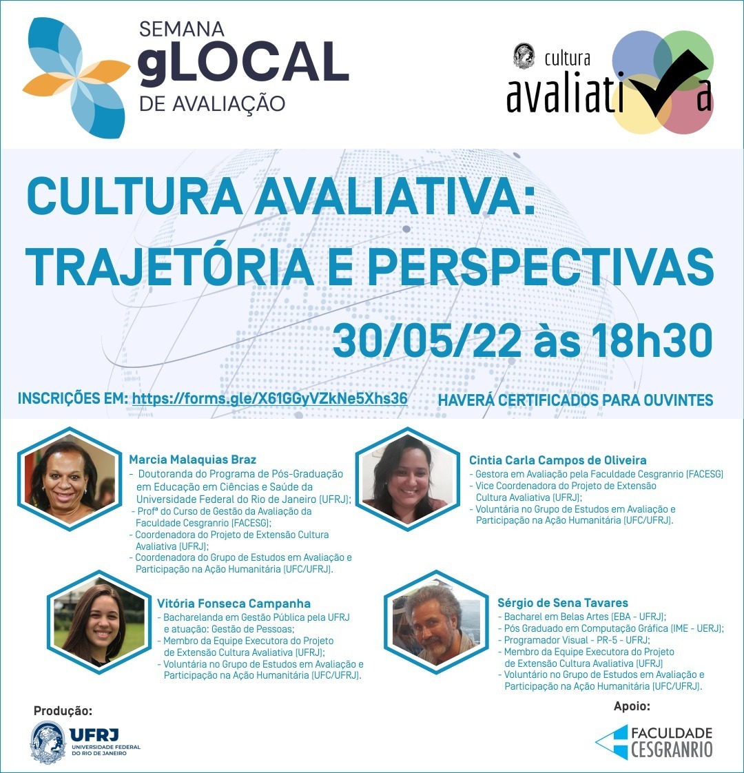 Apresentação da trajetória do Projeto de Extensão Cultura Avaliativa e os desafios futuros visando o fortalecimento e a visibilidade dos princípios desta iniciativa que tem como objetivo difundir e fortalecer o pensamento sistêmico no campo da avaliação numa abordagem participativa e democrática que potencialize a articulação de pessoas de diferentes áreas e segmentos de atuação na sociedade. A trajetória do Cultura Avaliativa inicia nos anos de 2018 e desde essa época vêm desenvolvendo e consolidando inúmeras ações de extensão vinculadas à Pró-Reitoria de Extensão da Universidade Federal do Rio de Janeiro (UFRJ), e conta com a colaboração de discentes, técnicos e docentes da UFRJ, estudantes, técnicos e professores do curso de graduação Gestão da Avaliação da Faculdade Cesgranrio (FACESG), e parceria com a Universidade Federal do Ceará, além de outras parcerias interinstitucionais.